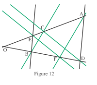 Pour le démontrer, il suffit d’appliquer Thalès aux différents systèmes de triangles et de parallèles constituant cette figure (fig. 12) :