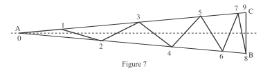 Pour qu’un tel iso-zigzag existe, il faut et il suffit que l’angle au sommet A soit égal à $\frac{180^{\circ}}{2n-1}$ . En effet, un calcul simple nous montre que les triangles isocèles successifs (012 ; 123 ; 234 ; etc.) ont pour angles à la base $\alpha, 2\alpha, 3\alpha$, etc, si $\alpha$ est l’angle au sommet $A_0$. Le dernier triangle $A_{n−2}A_{n−1}A_n$ a pour angle à la base $(n-1)\alpha$ qui doit aussi être l’angle à la base du triangle ABC, soit $\frac{180^{\circ}-\alpha}{2}=(n-1)\alpha$ ; d’où la valeur annoncée de $\frac{180^{\circ}}{2n-1}$ pour l’angle au sommet $A_0$. Pour vérification, si celui-ci vaut 20°, on trouve un iso-zigzag de cinq branches.