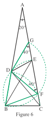 De fait, si l’on reporte à nouveau la longueur DF = FD = BC en DG, le triangle FDG est isocèle en D, de sorte que l’on en déduit la valeur de l’angle $\widehat{ADG}=20$° . Donc le triangle AGD est également isocèle, en G, et l’on a ainsi mis en évidence ce que Henri Bareil [4] appelle un iso-zigzag AGDFBC, qui donne la raison profonde de l’efficacité de cette solution.