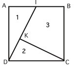 Un carré est coupé en 3 "pièces" par un segment joignant un sommet au milieu d’un côté (bien choisi !) et un autre segment perpendiculaire au segment précédent et rejoignant un sommet, lui aussi bien choisi pour définir les 3 morceaux du puzzle.